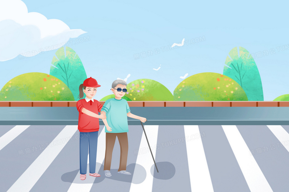 本作品内容为志愿者扶盲人过马路插画, 格式为 psd, 大小7 MB, 请使用软件PhotoShop(CC)打开, 源文件无水印, 欢迎使用熊猫办公。 如认为平台内容涉嫌侵权,可通过邮件:tousu@tukuppt.com提出书面通知,我们将及时处理。