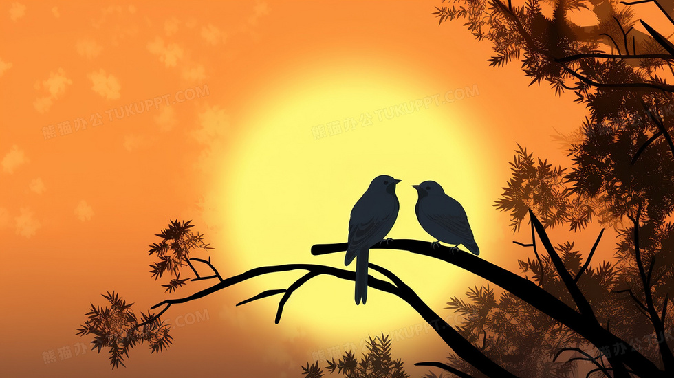 本作品内容为黄昏下在树枝上站立的小鸟剪影插画, 格式为 jpg, 大小3 MB, 图片尺寸为2912 x 1632, 源文件无水印, 欢迎使用熊猫办公。 如认为平台内容涉嫌侵权,可通过邮件:tousu@tukuppt.com提出书面通知,我们将及时处理。