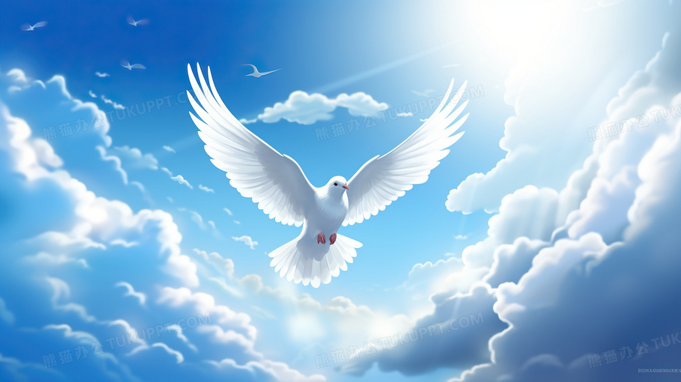本作品内容为世界和平日蓝天白云和平鸽插画, 格式为 jpg, 大小5 MB, 图片尺寸为2912 x 1632, 源文件无水印, 欢迎使用熊猫办公。 如认为平台内容涉嫌侵权,可通过邮件:tousu@tukuppt.com提出书面通知,我们将及时处理。