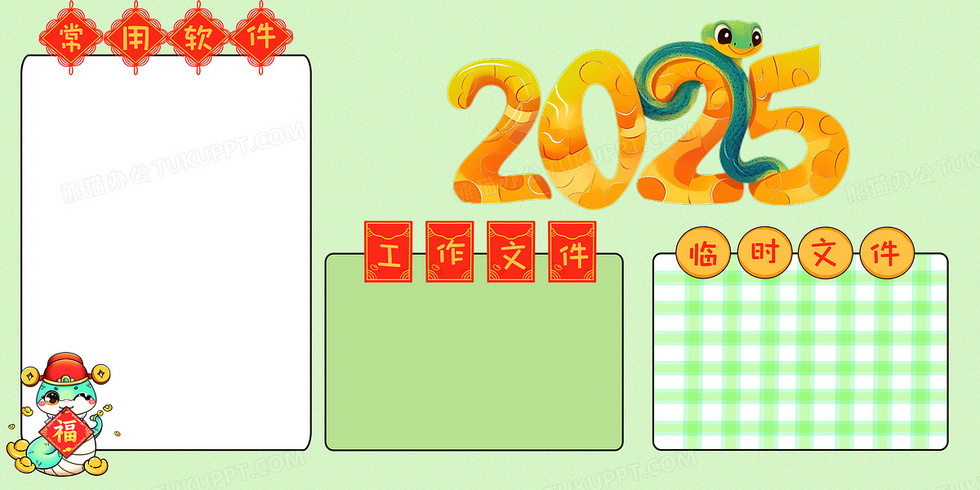 本作品内容为绿色卡通蛇年2025桌面背景, 格式为 psd, 大小23 MB, 图片尺寸为4722 x 2361, 作品中背景图片无需修改, 源文件无水印,可以直接使用, 欢迎使用熊猫办公。 如认为平台内容涉嫌侵权,可通过邮件:tousu@tukuppt.com提出书面通知,我们将及时处理。