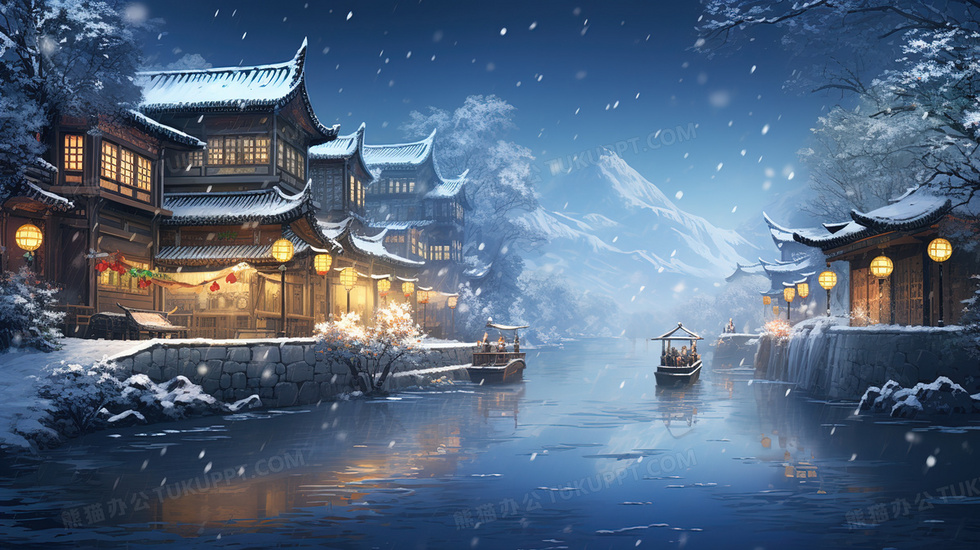 本作品内容为中国风大雪中临河两岸灯火通明的楼阁建筑插画, 格式为 jpg, 大小6 MB, 图片尺寸为2912 x 1632, 源文件无水印, 欢迎使用熊猫办公。 如认为平台内容涉嫌侵权,可通过邮件:tousu@tukuppt.com提出书面通知,我们将及时处理。