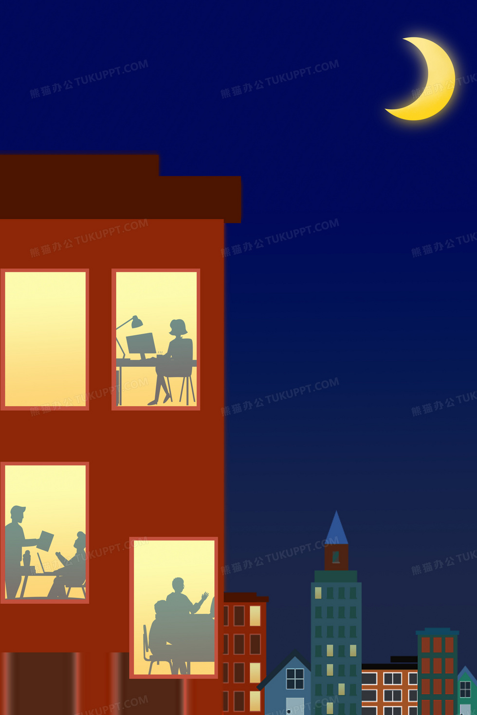 本作品内容为加班中的办公楼背景, 格式为 psd, 大小14 MB, 图片尺寸为3543 x 5314, 作品中背景图片无需修改, 源文件无水印,可以直接使用, 欢迎使用熊猫办公。 如认为平台内容涉嫌侵权,可通过邮件:tousu@tukuppt.com提出书面通知,我们将及时处理。