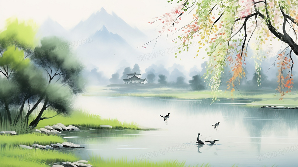 本作品内容为江边嫩绿垂柳远山树林唯美景色插画, 格式为 jpg, 大小6 MB, 图片尺寸为2912 x 1632, 源文件无水印, 欢迎使用熊猫办公。 如认为平台内容涉嫌侵权,可通过邮件:tousu@tukuppt.com提出书面通知,我们将及时处理。