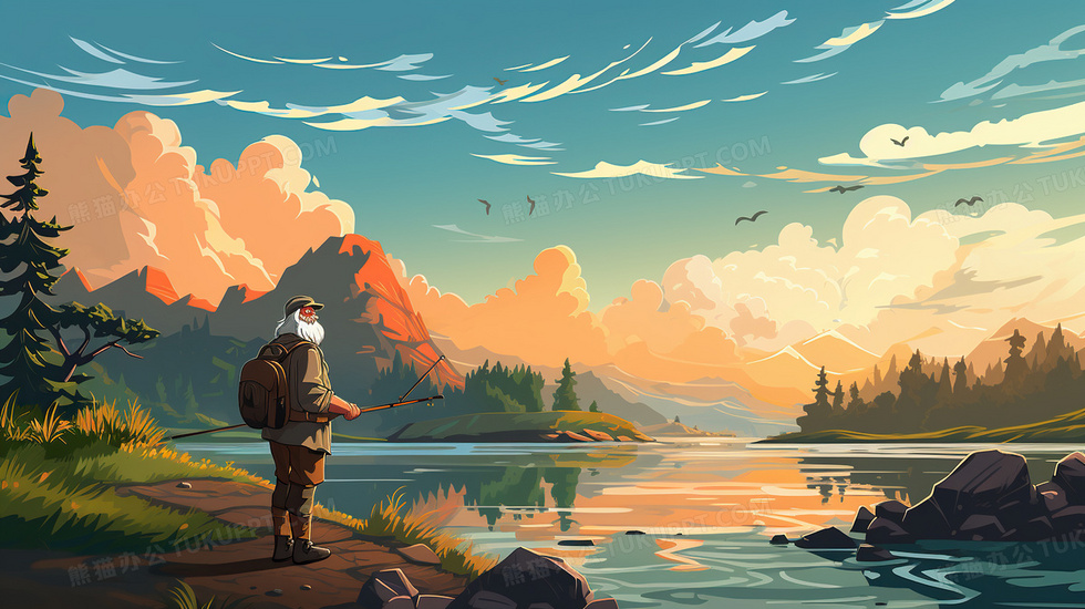 本作品内容为卡通老爷爷在河边钓鱼场景插画, 格式为 jpg, 大小5 MB, 图片尺寸为2912 x 1632, 源文件无水印, 欢迎使用熊猫办公。 如认为平台内容涉嫌侵权,可通过邮件:tousu@tukuppt.com提出书面通知,我们将及时处理。