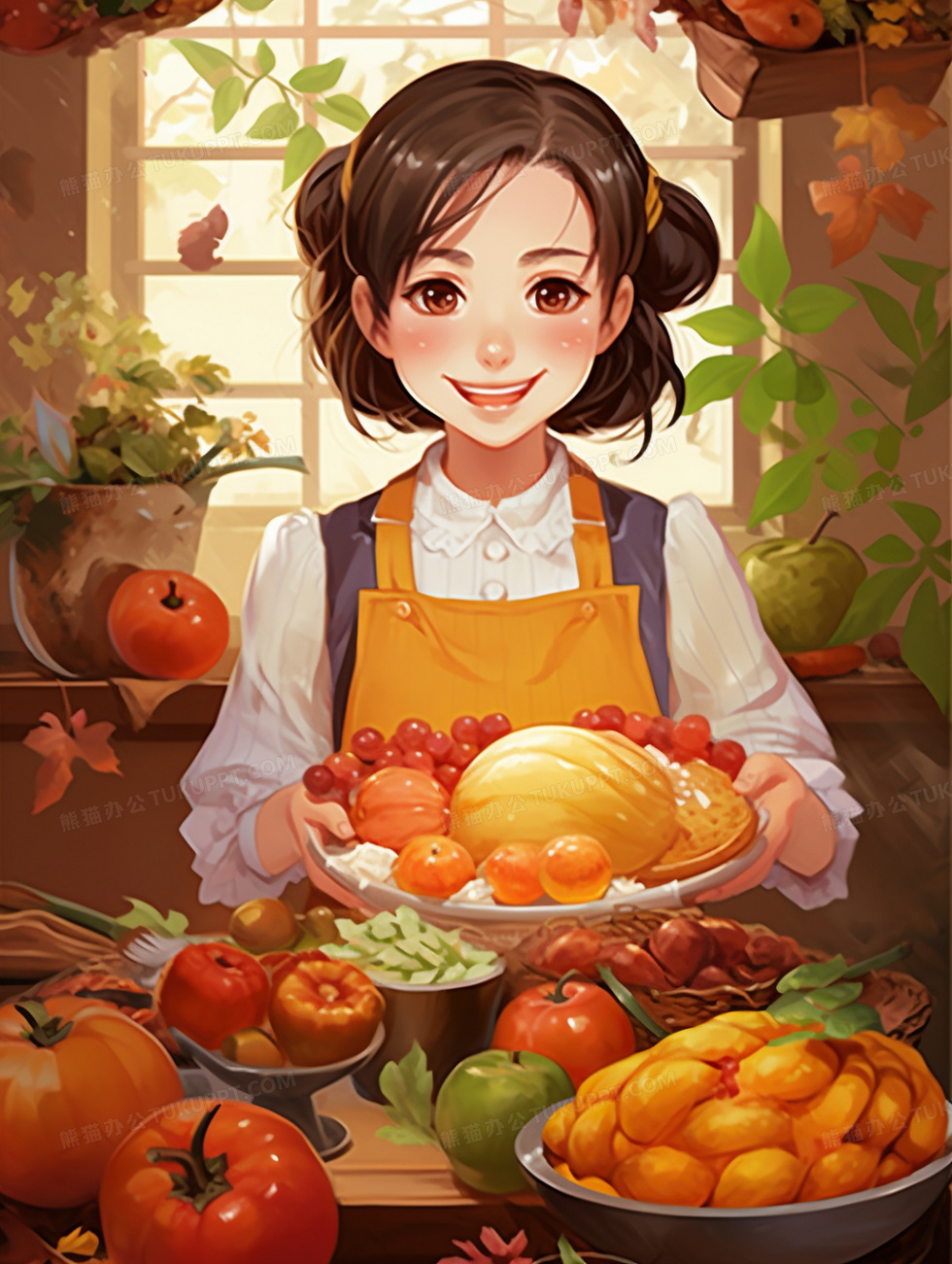 本作品内容为感恩节女孩烤鸡美食插画, 格式为 jpg, 大小5 MB, 图片尺寸为1760 x 2336, 源文件无水印, 欢迎使用熊猫办公。 如认为平台内容涉嫌侵权,可通过邮件:tousu@tukuppt.com提出书面通知,我们将及时处理。