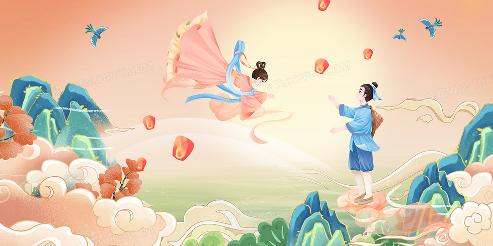 本作品内容为七夕牛郎织女国潮风背景, 格式为 psd, 大小32 MB, 图片尺寸为4722 x 2361, 作品中背景图片无需修改, 源文件无水印,可以直接使用, 欢迎使用熊猫办公。 如认为平台内容涉嫌侵权,可通过邮件:tousu@tukuppt.com提出书面通知,我们将及时处理。