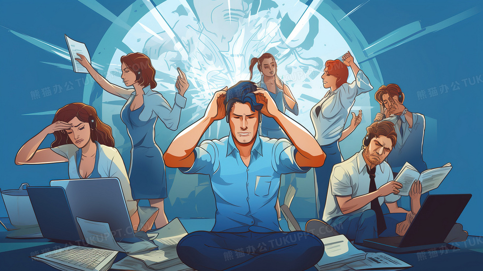 本作品内容为压力山大的职场人士插画, 格式为 jpg, 大小6 MB, 图片尺寸为2912 x 1632, 源文件无水印, 欢迎使用熊猫办公。 如认为平台内容涉嫌侵权,可通过邮件:tousu@tukuppt.com提出书面通知,我们将及时处理。