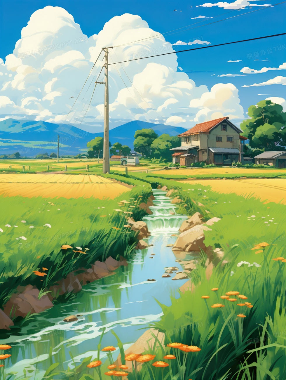 本作品内容为蓝天白云草地村庄唯美风景插画, 格式为 jpg, 大小6 MB, 图片尺寸为1856 x 2464, 源文件无水印, 欢迎使用熊猫办公。 如认为平台内容涉嫌侵权,可通过邮件:tousu@tukuppt.com提出书面通知,我们将及时处理。