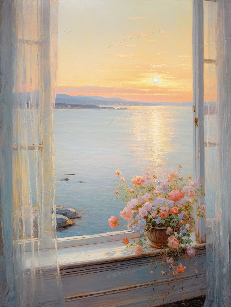 本作品内容为油画质感窗边风景花卉静物插画, 格式为 jpg, 大小7 MB, 图片尺寸为1856 x 2464, 源文件无水印, 欢迎使用熊猫办公。 如认为平台内容涉嫌侵权,可通过邮件:tousu@tukuppt.com提出书面通知,我们将及时处理。