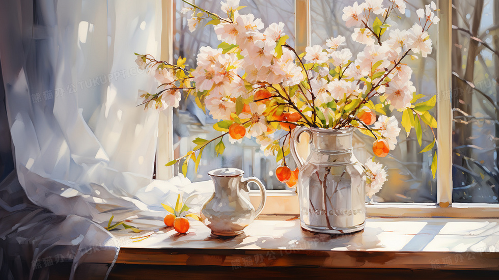 本作品内容为唯美小清新风窗台花盆油画插画, 格式为 jpg, 大小6 MB, 图片尺寸为2912 x 1632, 源文件无水印, 欢迎使用熊猫办公。 如认为平台内容涉嫌侵权,可通过邮件:tousu@tukuppt.com提出书面通知,我们将及时处理。