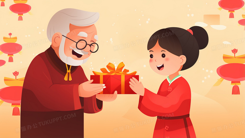 本作品内容为过年家中小孩给老人长辈送礼物温馨插画, 格式为 jpg, 大小4 MB, 图片尺寸为2912 x 1632, 源文件无水印, 欢迎使用熊猫办公。 如认为平台内容涉嫌侵权,可通过邮件:tousu@tukuppt.com提出书面通知,我们将及时处理。