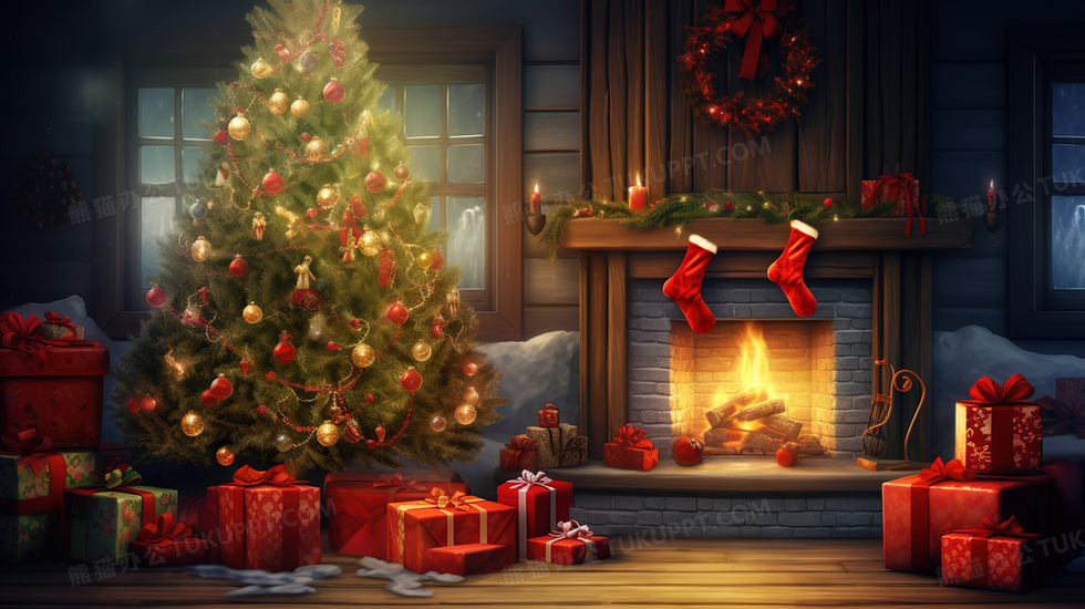 本作品内容为壁炉旁的圣诞树和礼物圣诞节插画, 格式为 jpg, 大小5 MB, 图片尺寸为2912 x 1632, 源文件无水印, 欢迎使用熊猫办公。 如认为平台内容涉嫌侵权,可通过邮件:tousu@tukuppt.com提出书面通知,我们将及时处理。