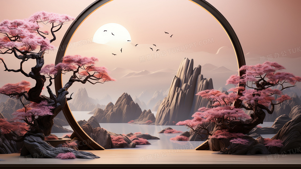 本作品内容为圆月山水粉梅古典电商展示台概念图片, 格式为 jpg, 大小7 MB, 图片尺寸为2912 x 1632, 源文件无水印, 欢迎使用熊猫办公。 如认为平台内容涉嫌侵权,可通过邮件:tousu@tukuppt.com提出书面通知,我们将及时处理。