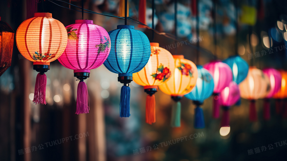 本作品内容为彩色新年中式花灯灯笼插画, 格式为 jpg, 大小5 MB, 图片尺寸为2912 x 1632, 源文件无水印, 欢迎使用熊猫办公。 如认为平台内容涉嫌侵权,可通过邮件:tousu@tukuppt.com提出书面通知,我们将及时处理。