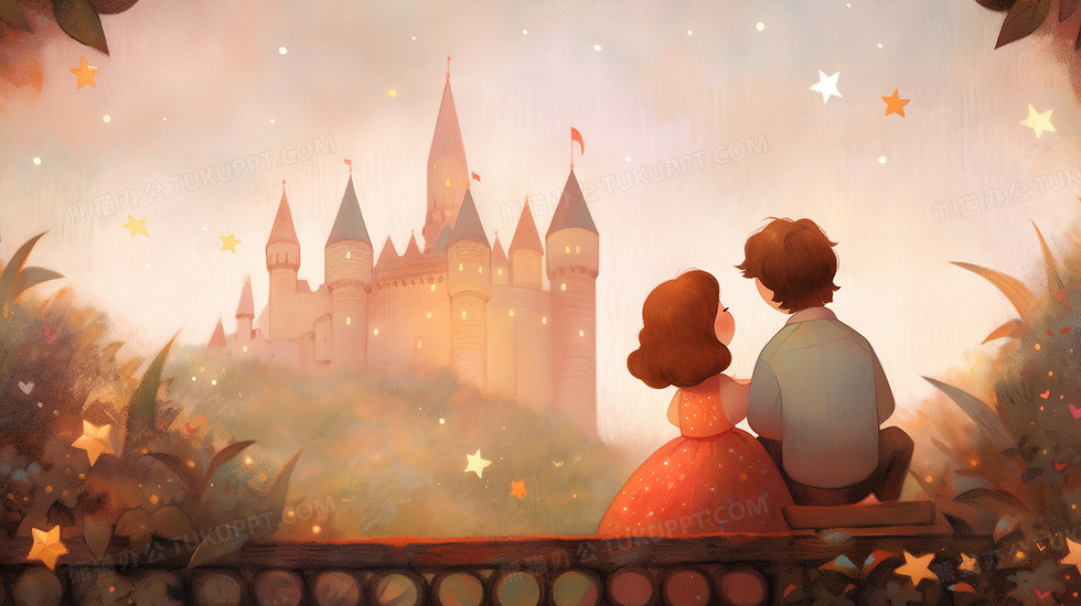 本作品内容为坐在围栏上远眺城堡的情侣插画, 格式为 jpg, 大小3 MB, 图片尺寸为2912 x 1632, 源文件无水印, 欢迎使用熊猫办公。 如认为平台内容涉嫌侵权,可通过邮件:tousu@tukuppt.com提出书面通知,我们将及时处理。