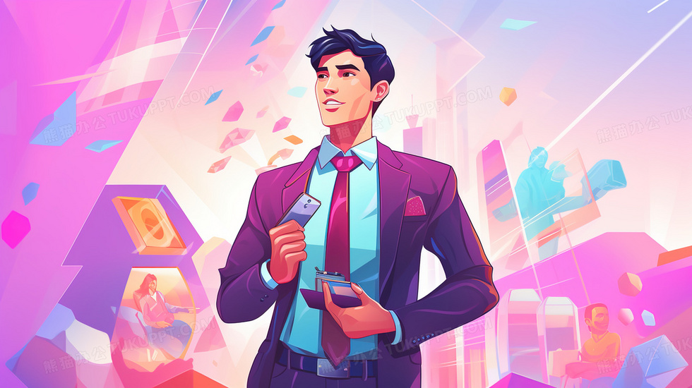 本作品内容为一位男性销售精英插画, 格式为 jpg, 大小4 MB, 图片尺寸为2912 x 1632, 源文件无水印, 欢迎使用熊猫办公。 如认为平台内容涉嫌侵权,可通过邮件:tousu@tukuppt.com提出书面通知,我们将及时处理。