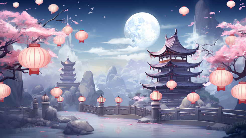 本作品内容为中秋节中国风建筑场景插画, 格式为 jpg, 大小6 MB, 图片尺寸为2912 x 1632, 源文件无水印, 欢迎使用熊猫办公。 如认为平台内容涉嫌侵权,可通过邮件:tousu@tukuppt.com提出书面通知,我们将及时处理。