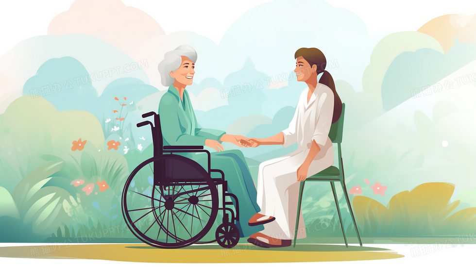 本作品内容为陪伴坐轮椅的老人谈心温馨插画, 格式为 jpg, 大小4 MB, 图片尺寸为2912 x 1632, 源文件无水印, 欢迎使用熊猫办公。 如认为平台内容涉嫌侵权,可通过邮件:tousu@tukuppt.com提出书面通知,我们将及时处理。