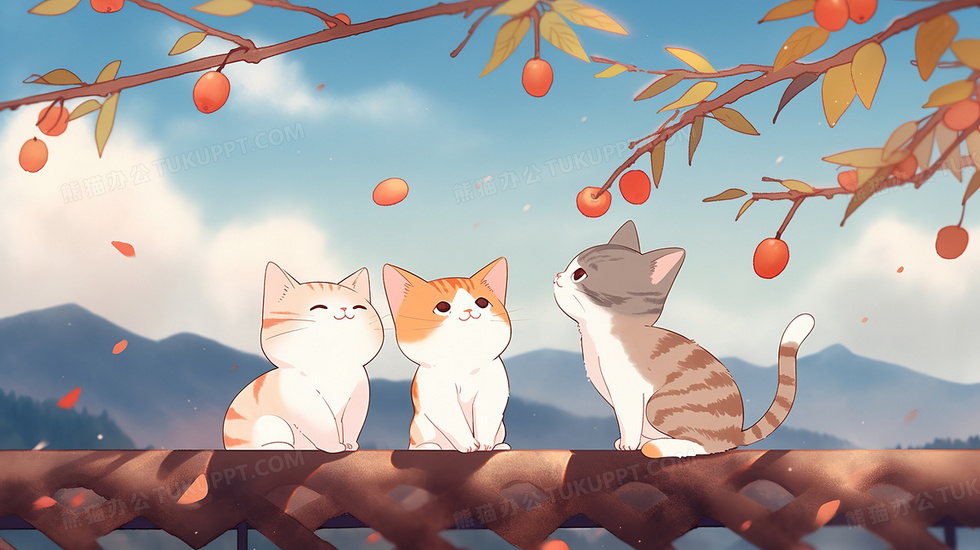 本作品内容为霜降节气摘柿子的猫咪创意插画, 格式为 jpg, 大小3 MB, 图片尺寸为2912 x 1632, 源文件无水印, 欢迎使用熊猫办公。 如认为平台内容涉嫌侵权,可通过邮件:tousu@tukuppt.com提出书面通知,我们将及时处理。