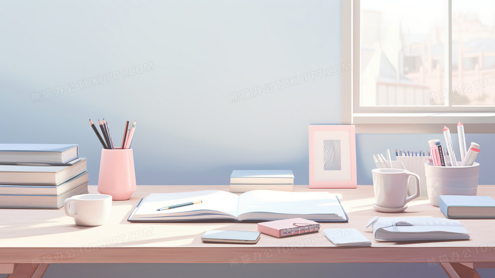 本作品内容为干净整洁的粉色系女孩房间书桌书本文具插画, 格式为 jpg, 大小4 MB, 图片尺寸为2912 x 1632, 源文件无水印, 欢迎使用熊猫办公。 如认为平台内容涉嫌侵权,可通过邮件:tousu@tukuppt.com提出书面通知,我们将及时处理。