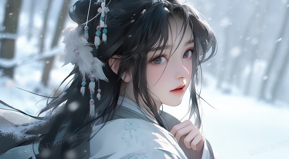 本作品内容为唯美古风冬日雪景中的少女创意插画, 格式为 jpg, 大小6 MB, 图片尺寸为2912 x 1608, 源文件无水印, 欢迎使用熊猫办公。 如认为平台内容涉嫌侵权,可通过邮件:tousu@tukuppt.com提出书面通知,我们将及时处理。