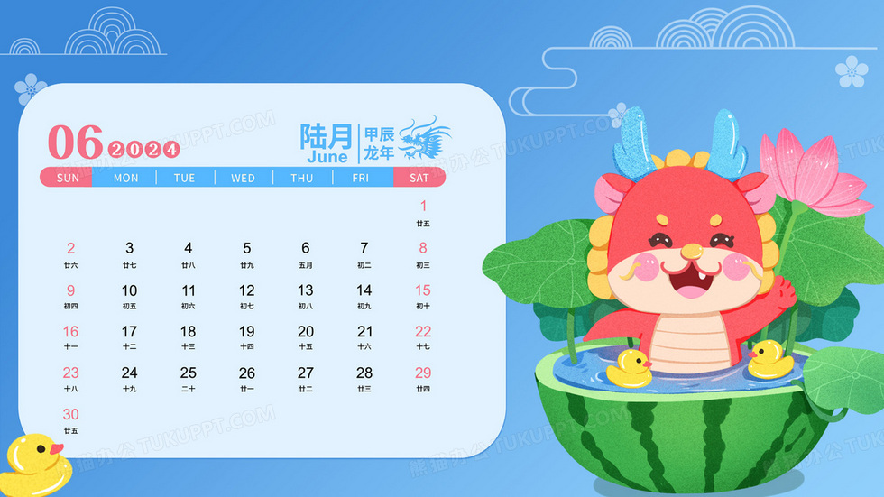 本作品内容为2024年龙年日历6月台历插画, 格式为 psd, 大小24 MB, 请使用软件PhotoShop(CC)打开, 源文件无水印, 欢迎使用熊猫办公。 如认为平台内容涉嫌侵权,可通过邮件:tousu@tukuppt.com提出书面通知,我们将及时处理。