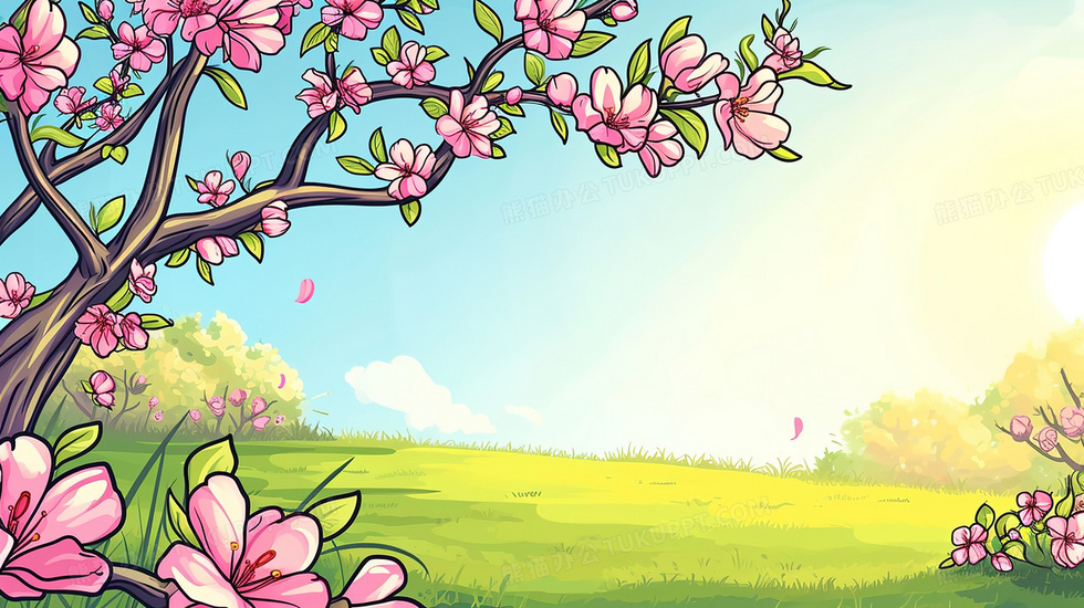 本作品内容为春日青青草地上盛开的樱花树插画, 格式为 jpg, 大小3 MB, 图片尺寸为2912 x 1632, 源文件无水印, 欢迎使用熊猫办公。 如认为平台内容涉嫌侵权,可通过邮件:tousu@tukuppt.com提出书面通知,我们将及时处理。