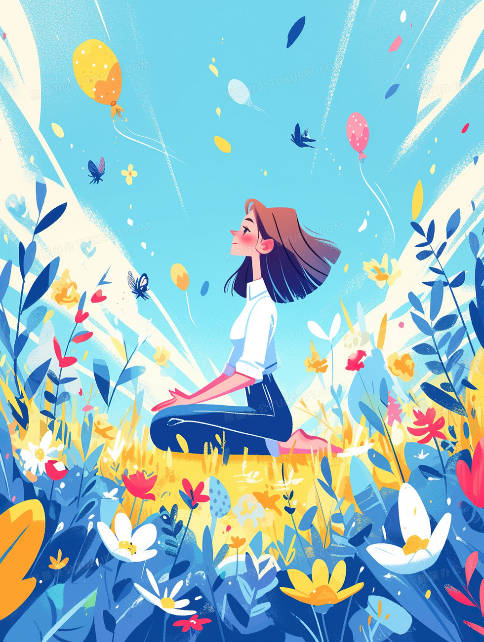 本作品内容为蓝天白云在花丛中做瑜伽插画, 格式为 jpg, 大小3 MB, 图片尺寸为1856 x 2464, 源文件无水印, 欢迎使用熊猫办公。 如认为平台内容涉嫌侵权,可通过邮件:tousu@tukuppt.com提出书面通知,我们将及时处理。