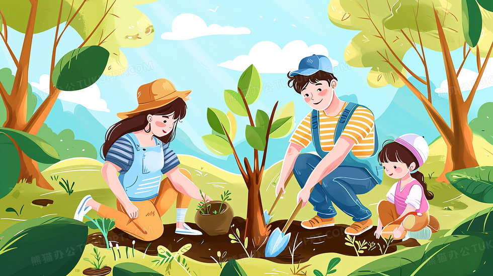 本作品内容为父母带着孩子植树插画, 格式为 jpg, 大小3 MB, 图片尺寸为2912 x 1632, 源文件无水印, 欢迎使用熊猫办公。 如认为平台内容涉嫌侵权,可通过邮件:tousu@tukuppt.com提出书面通知,我们将及时处理。