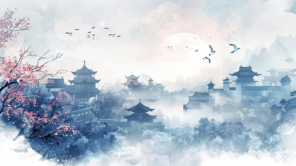 本作品内容为中国风水墨山水画插画, 格式为 jpg, 大小4 MB, 图片尺寸为2912 x 1632, 源文件无水印, 欢迎使用熊猫办公。 如认为平台内容涉嫌侵权,可通过邮件:tousu@tukuppt.com提出书面通知,我们将及时处理。