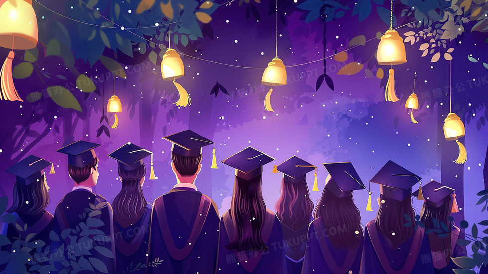 本作品内容为毕业季穿学士服的大学生背影插画, 格式为 jpg, 大小3 MB, 图片尺寸为2912 x 1632, 源文件无水印, 欢迎使用熊猫办公。 如认为平台内容涉嫌侵权,可通过邮件:tousu@tukuppt.com提出书面通知,我们将及时处理。