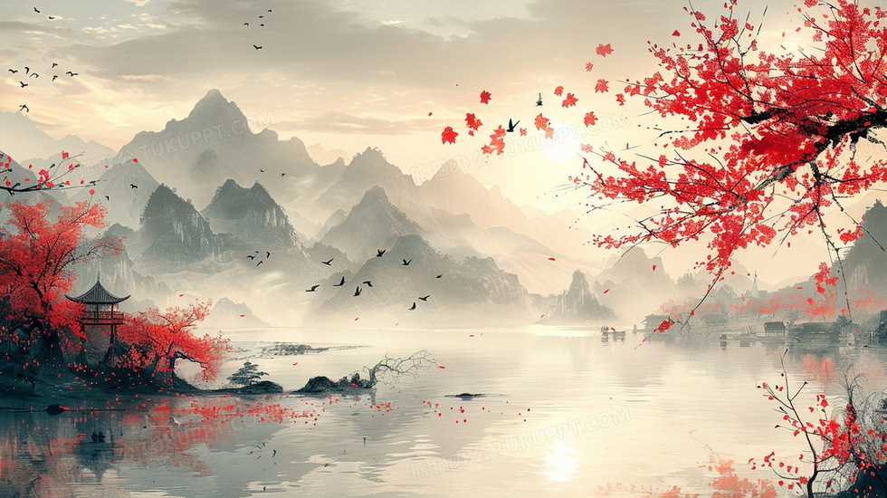 本作品内容为中国水墨风格江面景色插画, 格式为 jpg, 大小3 MB, 图片尺寸为2240 x 1256, 源文件无水印, 欢迎使用熊猫办公。 如认为平台内容涉嫌侵权,可通过邮件:tousu@tukuppt.com提出书面通知,我们将及时处理。