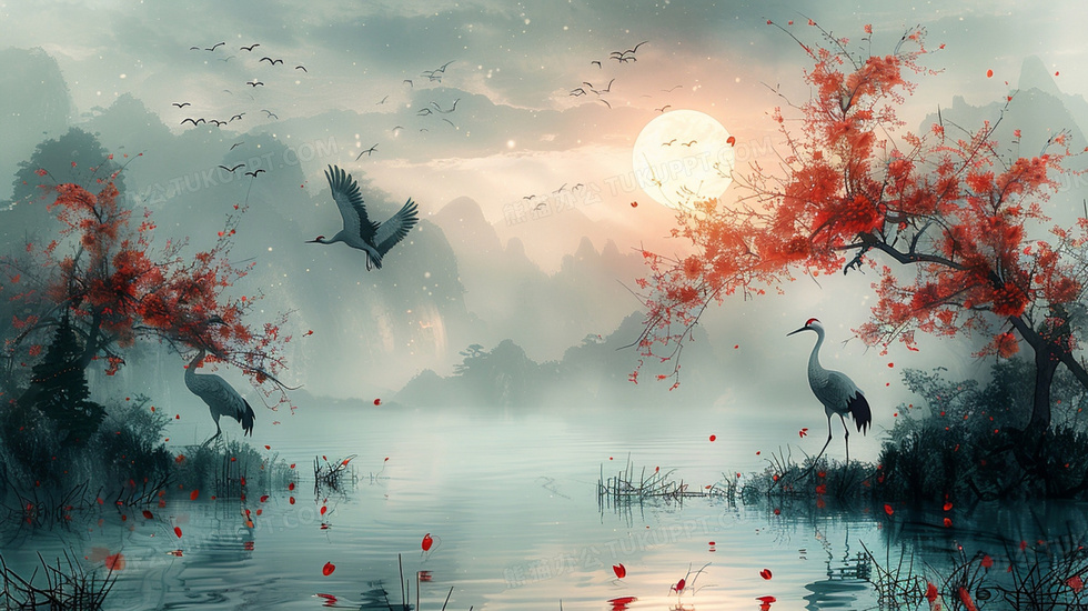 本作品内容为丹顶鹤湖面风景自然插画, 格式为 jpg, 大小2 MB, 图片尺寸为2240 x 1256, 源文件无水印, 欢迎使用熊猫办公。 如认为平台内容涉嫌侵权,可通过邮件:tousu@tukuppt.com提出书面通知,我们将及时处理。