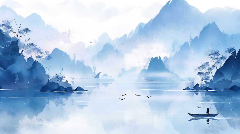本作品内容为山间水墨蓝色背景下湖水面上飘荡一个小船插画, 格式为 jpg, 大小3 MB, 图片尺寸为2912 x 1632, 源文件无水印, 欢迎使用熊猫办公。 如认为平台内容涉嫌侵权,可通过邮件:tousu@tukuppt.com提出书面通知,我们将及时处理。