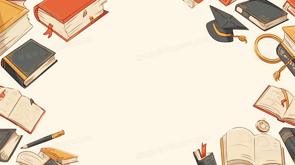 本作品内容为卡通毕业季书本边框背景, 格式为 jpg, 大小4 MB, 图片尺寸为2912 x 1632, 作品中背景图片无需修改, 源文件无水印,可以直接使用, 欢迎使用熊猫办公。 如认为平台内容涉嫌侵权,可通过邮件:tousu@tukuppt.com提出书面通知,我们将及时处理。