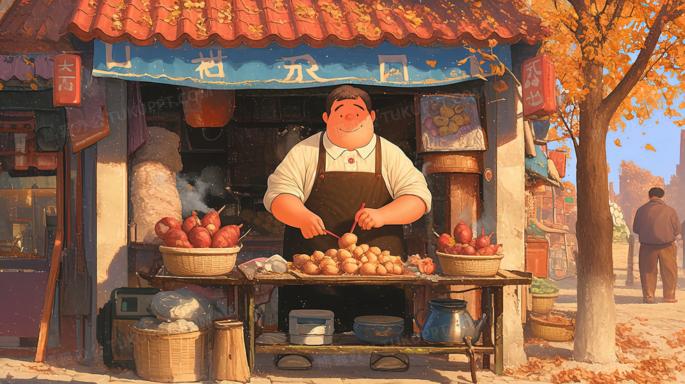 本作品内容为卖糖炒栗子烤红薯的男摊贩插画, 格式为 jpg, 大小4 MB, 图片尺寸为2912 x 1632, 源文件无水印, 欢迎使用熊猫办公。 如认为平台内容涉嫌侵权,可通过邮件:tousu@tukuppt.com提出书面通知,我们将及时处理。