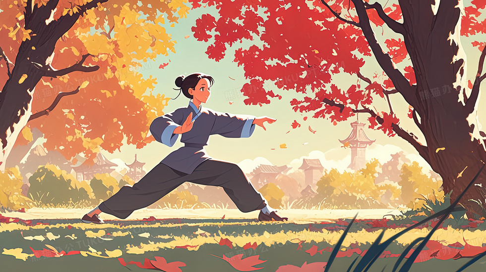 秋季养生公园练习中国功夫的少女插画