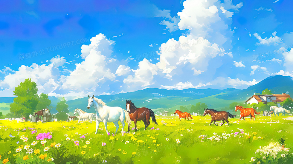 本作品内容为蓝天白云草原奔跑的骏马插画, 格式为 jpg, 大小3 MB, 图片尺寸为2912 x 1632, 源文件无水印, 欢迎使用熊猫办公。 如认为平台内容涉嫌侵权,可通过邮件:tousu@tukuppt.com提出书面通知,我们将及时处理。