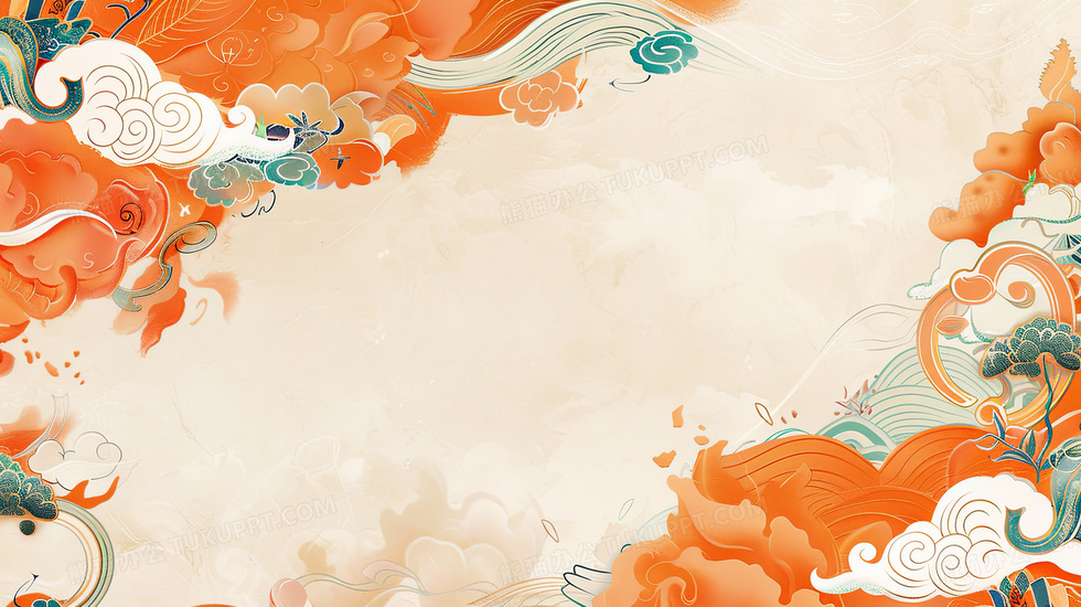 本作品内容为中国风橙色祥云背景, 格式为 jpg, 大小5 MB, 图片尺寸为2912 x 1632, 作品中背景图片无需修改, 源文件无水印,可以直接使用, 欢迎使用熊猫办公。 如认为平台内容涉嫌侵权,可通过邮件:tousu@tukuppt.com提出书面通知,我们将及时处理。