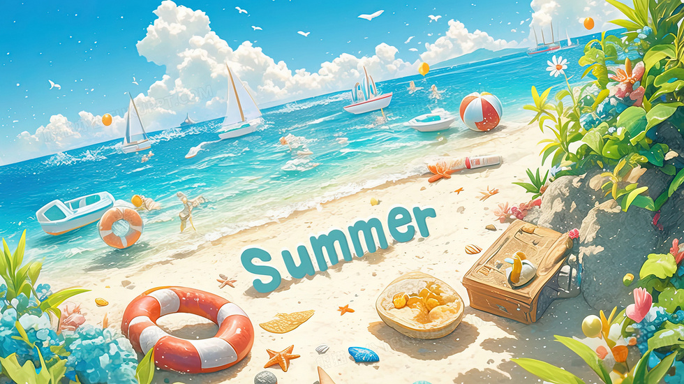 本作品内容为蓝天白云夏日海边沙滩插画, 格式为 jpg, 大小3 MB, 图片尺寸为2912 x 1632, 源文件无水印, 欢迎使用熊猫办公。 如认为平台内容涉嫌侵权,可通过邮件:tousu@tukuppt.com提出书面通知,我们将及时处理。