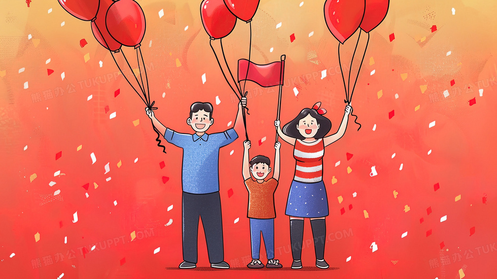 本作品内容为红色背景一家人喜迎国庆气球喜庆装饰插画, 格式为 jpg, 大小3 MB, 图片尺寸为2912 x 1632, 源文件无水印, 欢迎使用熊猫办公。 如认为平台内容涉嫌侵权,可通过邮件:tousu@tukuppt.com提出书面通知,我们将及时处理。