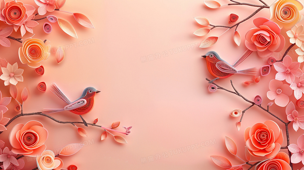 本作品内容为粉色纸艺花鸟浪漫背景, 格式为 jpg, 大小3 MB, 图片尺寸为2912 x 1632, 作品中背景图片无需修改, 源文件无水印,可以直接使用, 欢迎使用熊猫办公。 如认为平台内容涉嫌侵权,可通过邮件:tousu@tukuppt.com提出书面通知,我们将及时处理。
