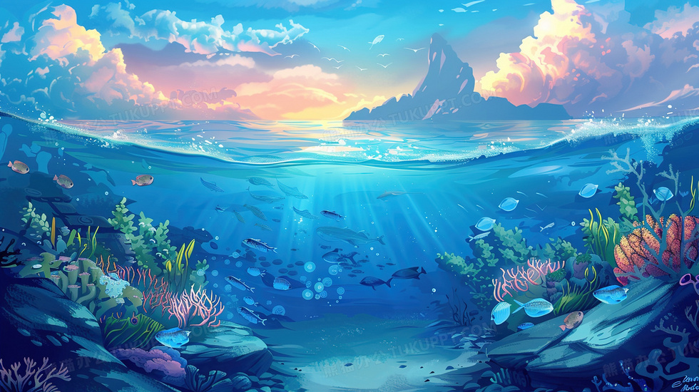 本作品内容为蓝天白云唯美海底世界插画, 格式为 jpg, 大小3 MB, 图片尺寸为2912 x 1632, 源文件无水印, 欢迎使用熊猫办公。 如认为平台内容涉嫌侵权,可通过邮件:tousu@tukuppt.com提出书面通知,我们将及时处理。