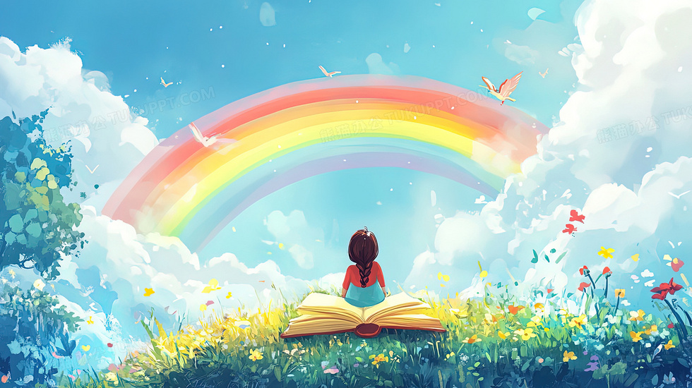 本作品内容为草地坐书本的女孩看彩虹天空插画, 格式为 jpg, 大小3 MB, 图片尺寸为2912 x 1632, 源文件无水印, 欢迎使用熊猫办公。 如认为平台内容涉嫌侵权,可通过邮件:tousu@tukuppt.com提出书面通知,我们将及时处理。