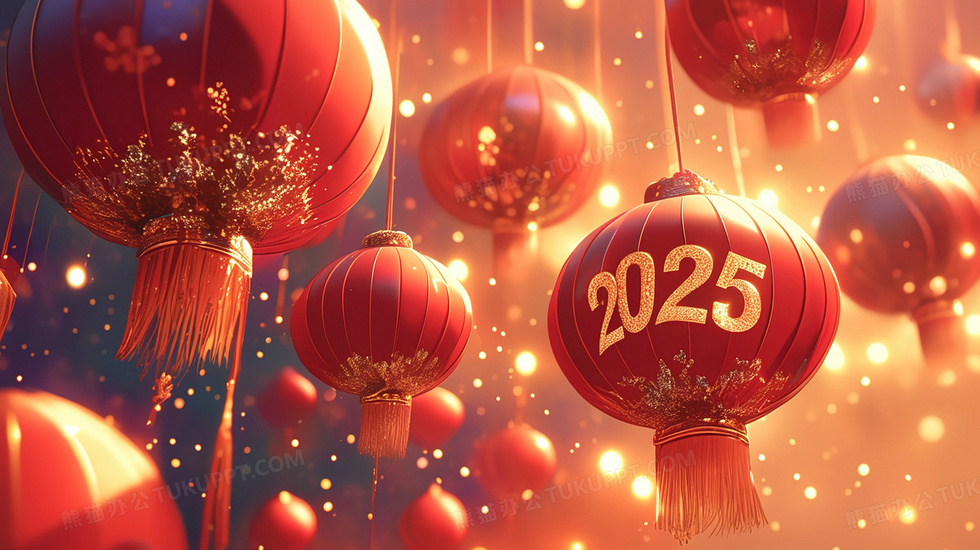 本作品内容为喜庆2025新年灯笼挂饰插画, 格式为 jpg, 大小3 MB, 图片尺寸为2912 x 1632, 源文件无水印, 欢迎使用熊猫办公。 如认为平台内容涉嫌侵权,可通过邮件:tousu@tukuppt.com提出书面通知,我们将及时处理。