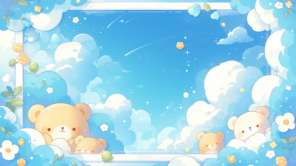 本作品内容为蓝色卡通小熊云朵边框背景, 格式为 jpg, 大小3 MB, 图片尺寸为2912 x 1632, 作品中背景图片无需修改, 源文件无水印,可以直接使用, 欢迎使用熊猫办公。 如认为平台内容涉嫌侵权,可通过邮件:tousu@tukuppt.com提出书面通知,我们将及时处理。