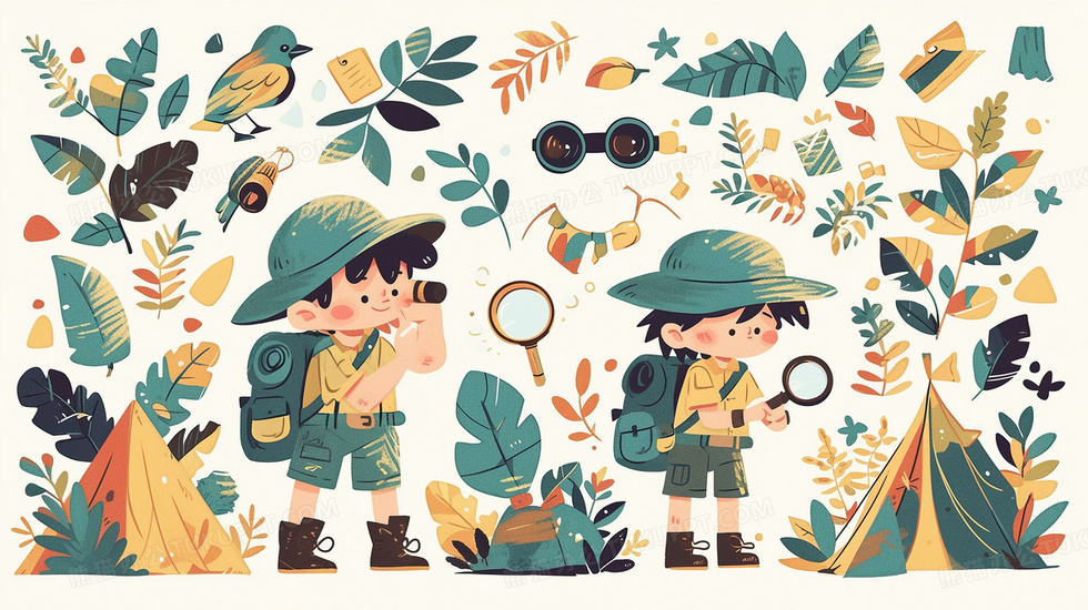 本作品内容为卡通小孩户外游玩夏令营贴纸手账插画, 格式为 jpg, 大小3 MB, 图片尺寸为2912 x 1632, 源文件无水印, 欢迎使用熊猫办公。 如认为平台内容涉嫌侵权,可通过邮件:tousu@tukuppt.com提出书面通知,我们将及时处理。