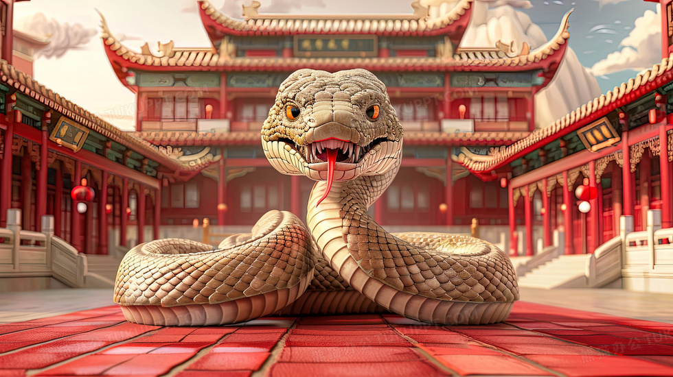 气势磅礴蛇年水墨中式建筑与蛇插画