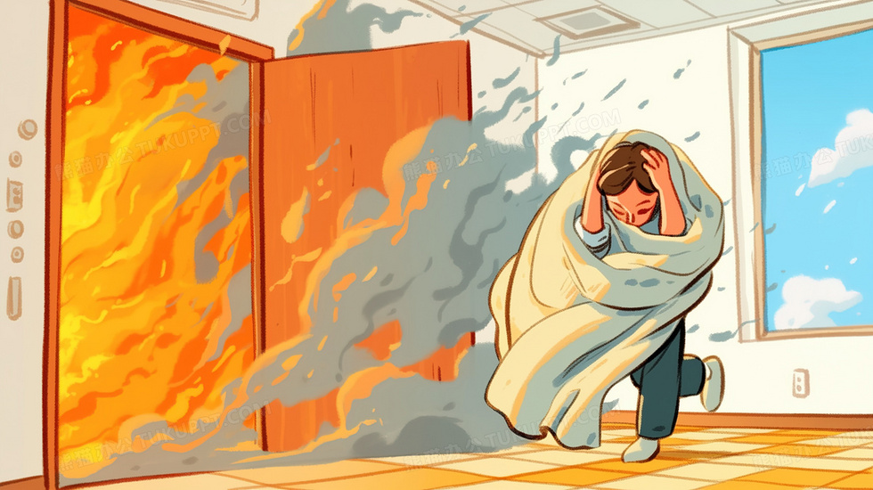 本作品内容为火灾裹着被子逃生的男子插画, 格式为 jpg, 大小2 MB, 图片尺寸为2912 x 1632, 源文件无水印, 欢迎使用熊猫办公。 如认为平台内容涉嫌侵权,可通过邮件:tousu@tukuppt.com提出书面通知,我们将及时处理。