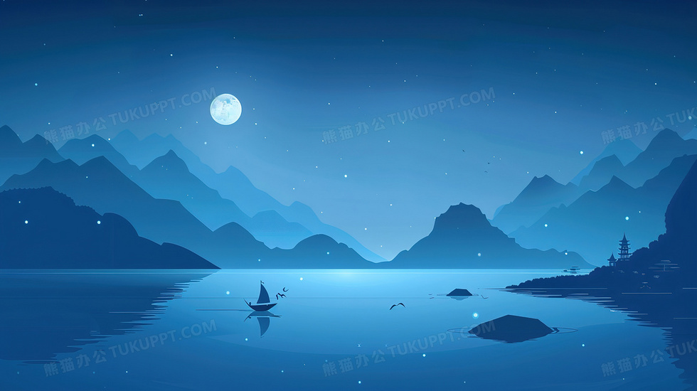 本作品内容为宁静黑夜月光山水背景, 格式为 jpg, 大小4 MB, 图片尺寸为2912 x 1632, 作品中背景图片无需修改, 源文件无水印,可以直接使用, 欢迎使用熊猫办公。 如认为平台内容涉嫌侵权,可通过邮件:tousu@tukuppt.com提出书面通知,我们将及时处理。